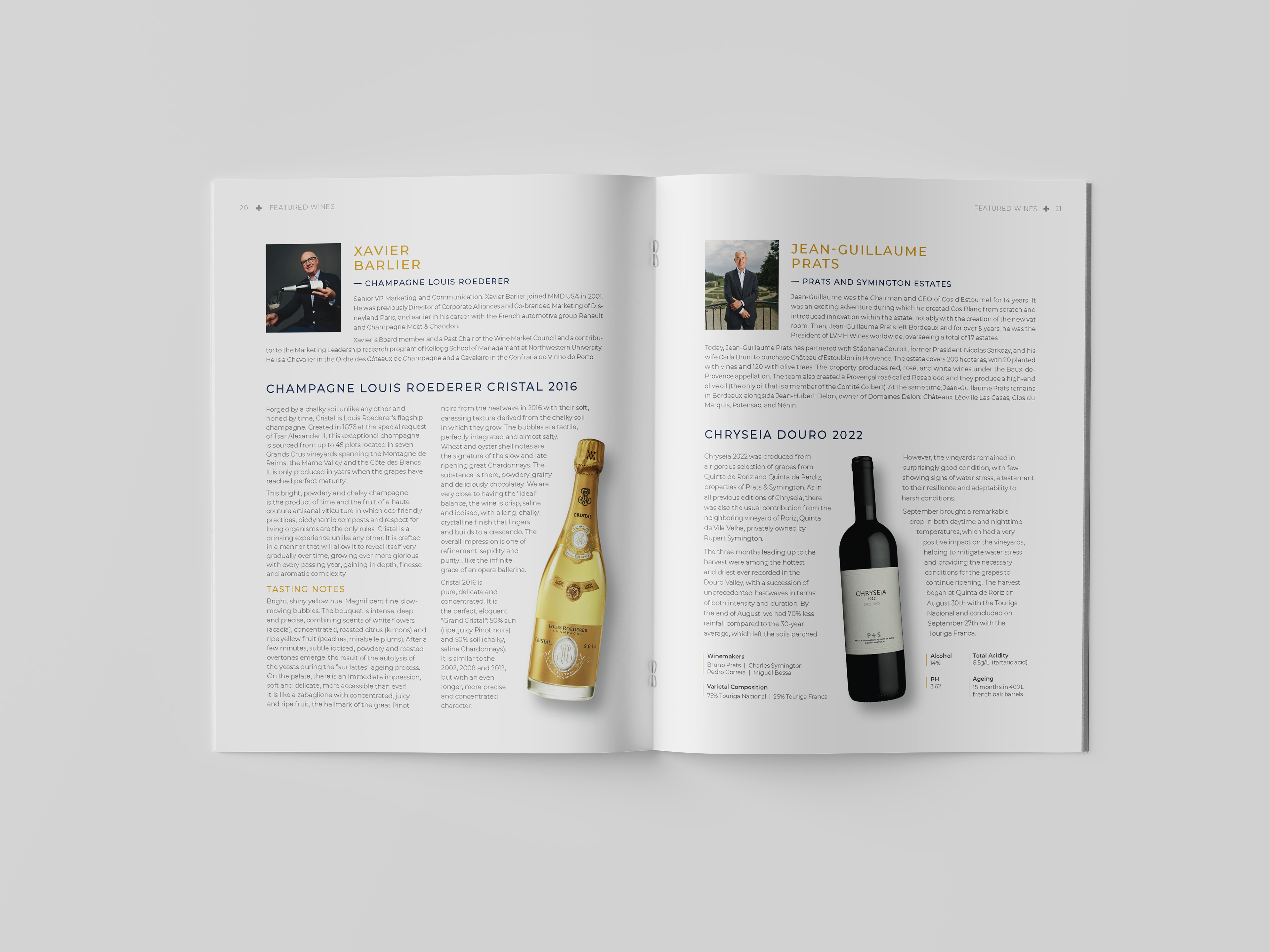 Our goal was to showcase the GFH initiatives alongside the participating wine producers, highlighting their significant contributions to the world. We selected a color palette of deep blue, contrasting white pages and gold accents, creating a clean and sophisticated layout that leaves space for key elements to shine.